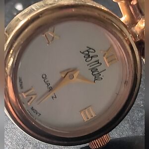 this is a rare and beautiful Bob Mackie gold ladies watch with a absolutely unique design like all of Bob Mackie designs . there are 3 perfect all natural amethyst on this watch and a beautiful round cut garnet and no clasp the wath is it's own clasp it smoothly wraps around the wrist and holds the watch super secure and comfortable .
