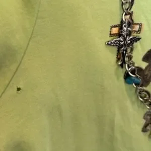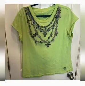 Lime green short sleeve top with intricate chain accents. Features cross details for a unique look. A rare T-shirt in this cool with all the jewels built in. Has a small hole on the right by the arm put... barely visible when on but I have posted picture of it...other than that it's a super cool top... I find double d tops run small and it fits but I just don't like tight or actually fitted..I prefer a looser t-shirt for my age.