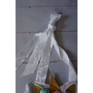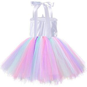 Rainbow tulle dress with a sequin unicorn bodice and satin tie straps. Features decorative metallic accents and floral details. Tulle does not light up; battery replacement required.