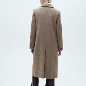 Wool mix fabric. Midi design. Lapel-collar V-neck collar. Long sleeve with buttoned cuffs. Two side pockets. Front button closure. The