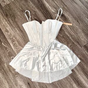 corset design, flattering boning, adjustable straps, a flowy bottom, lace-up detail, side seam with an invisible zipper, as well as a hook and eye closure.