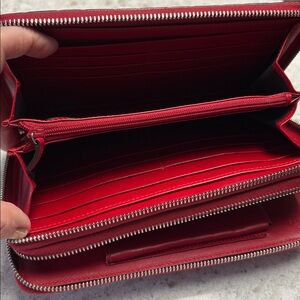 Elegant cherry red leather clutch with embossed Gucci design. Double zip around.