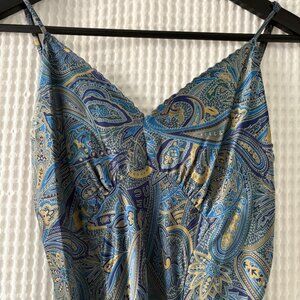 Vintage new with tags Victoria's Secret paisley silk slip dress. Adjustable straps. Slightly scalloped neckline and hem. On trend for fall and super soft and lightweight, as silk is. Wear it as a nightie or wear it for a night out. Size medium. Flat, it measures roughly 18 inches pit to pit and it's about 34 inches long as measured from the top of one strap to the hem. Shades of blue, taupe, indigo, etc.