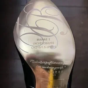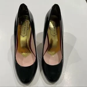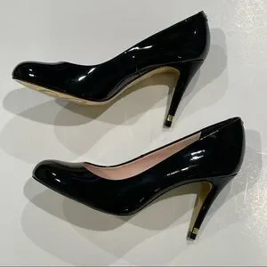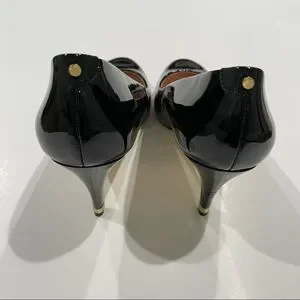Sleek black patent heels. Shiny gold accent on heel. Ideal for elegant events.