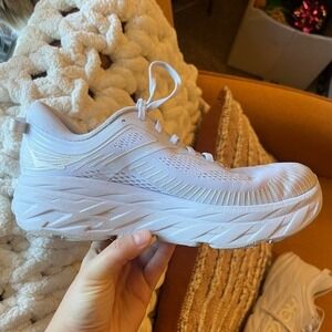These Hoka Bondi 7s are in the color white, size is a men's 8. These will also fit a women's size 9.5-10, and the heel is on the wider side for women. These are VERY gently used, only worn maybe once or twice. I bought these straight from Hoka a few years ago and they're just not the right fit for my feet. Please see photos for any small marks or scuffs.