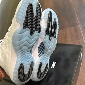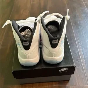 Classic Jordan high-tops. White leather with light blue accents. Perfect for style and comfort.