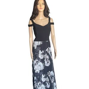 Styled with a striking off-the-shoulder neckline, this flowing gown from Xscape stuns with a floral print at the skirt brought to life with plenty of pleats.