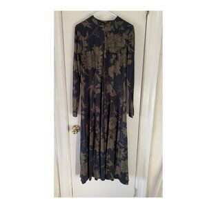 "Cementing florals in your fall wardrobe, ME+EM's Navy Scribble Floral Print Fit and Flare Maxi Dress features a bespoke print by the label in a combination of dark neutrals and gently hugs your frame."