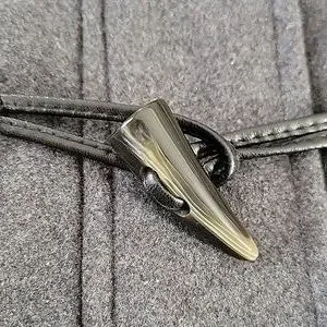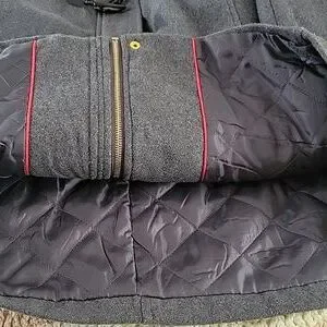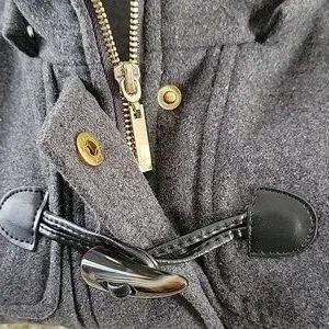 quilted lining on the inside. zip, snap, and toggle button closure. has pockets. neutral gray. great pre-owned condition. flat across bust is approx 23", length is approx 33", waist is approx 21".