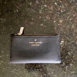 Chic black wallet by Kate Spade. Textured finish with a top zip closure.