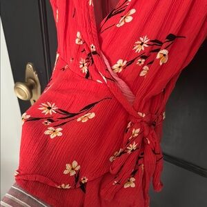 This sleeveless red camisole from One Clothing features a chic wrap design with ruffled accents, perfect for adding a touch of elegance to your wardrobe. The lightweight fabric and adjustable straps ensure comfort and style for warm weather occasions.