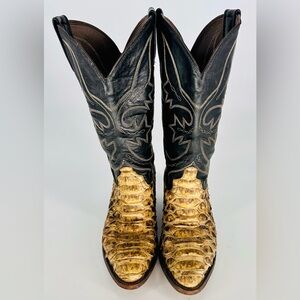 These rare vintage Snakeskin Cowboy Leather Boots are a stylish and unique addition to any wardrobe. With a slip-on closure, leather lining, and outsole, these boots offer both comfort and durability. The black and brown colors, combined with the cowboy theme and style, make these boots a versatile and eye-catching option for both women. The size ranges from a 7- 7.5 US.