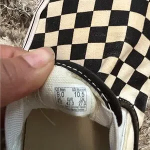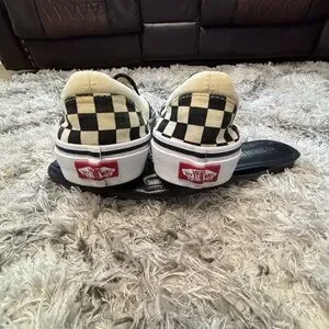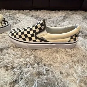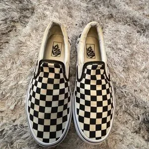 Vans slip-on shoes with a bold black and cream checkerboard design. Perfect for casual outings.