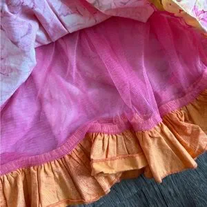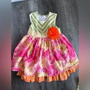 A burst of sunshine awaits with this adorable girls' outfit set. The charming dress features a green and white striped bodice that transitions into a vibrant floral skirt of pink and yellow roses, complemented by an orange ruffled hem and matching orange flower embellishment. Paired with coordinating green and white striped ruffle pants that echo the floral accents, this set ensures a delightful and coordinated look. Perfect for springtime celebrations, garden parties, or family photoshoots, it's sure to bring smiles and style to any occasion.