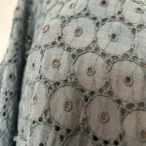 Chic blouse with button-up front. Features intricate lace detailing. Perfect for casual wear. Dolman sleeve.