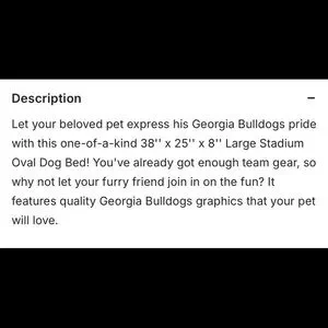 Large oval dog bed of the Georgia Bulldog Stadium. Brand new! Sealed inside box. Box opened to show product sealed inside.
