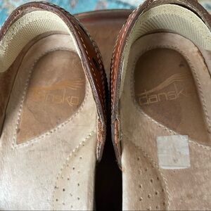 Unique Dansko leather clogs. I have never seen these anywhere. Lovely floral accents, and feminine cut. Perfect for fall! Excellent condition! I am a size 8, and they fit perfectly