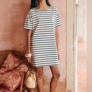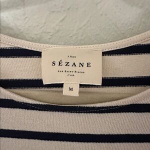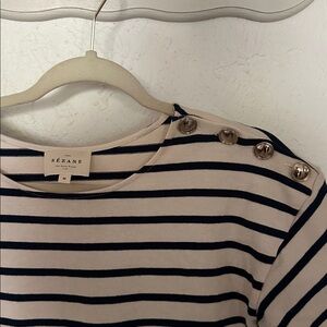 Stylish navy striped short sleeve top with button detail on the shoulder. Perfect for casual outings. Has a couple tiny spots I haven’t tried to get out. Otherwise gently used condition.