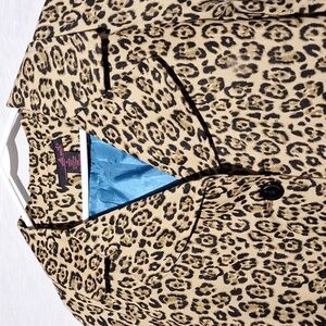 NEVER WORN! Make a statement with this cropped Y2K leopard print blazer with big Lapels and big black buttons. Jacket features a shiny blue lining and 3/4- length sleeves! Dry clean. 20 inches pit2pit; 24 inches length
