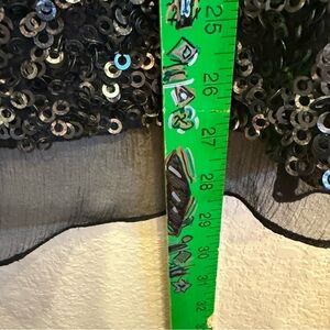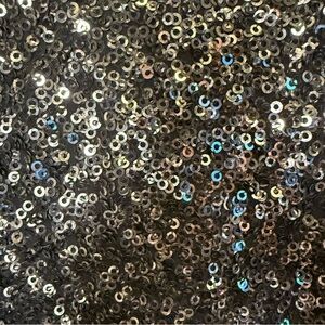 Elegant 100% silk black tank top with shimmering black circle sequins. Knit ribbed shoulders and neck. Hi-low cut.