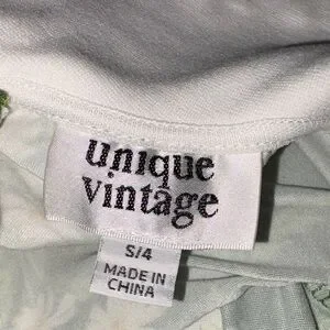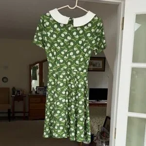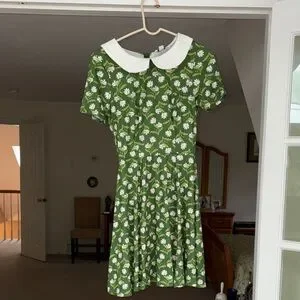 Cute dress with green floral design. Features a crisp white collar. Ideal for a chic, vintage-inspired look. Zipper in back/ hook and eye closure at neck