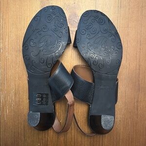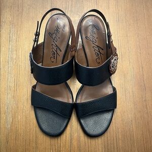 Chic black leather sandals with a stylish silver accent. Comfortable heel for versatile wear. Very good used condition.