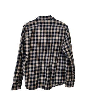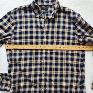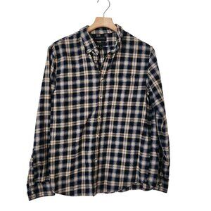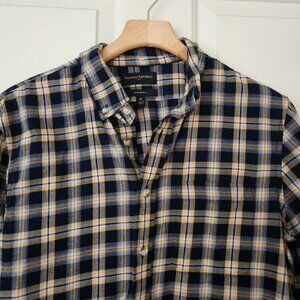 Banana Republic Untucked Fit navy, yellow and white plaid check shirt, Size Medium.