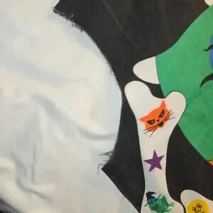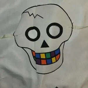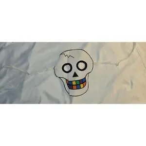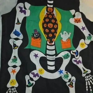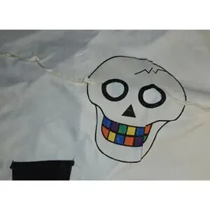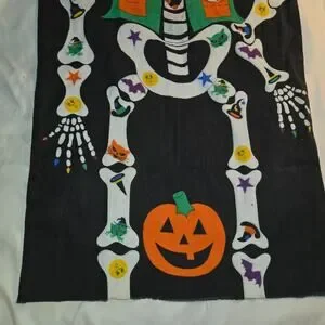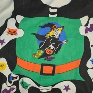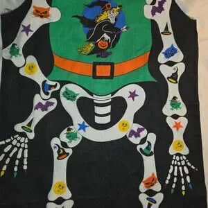 This is a Vintage Skeleton Halloween Costume which is a Two-Sided Pullover Sheet Fabric Piece with Tieback Mask. It is 31 inches long and 18 inches wide. The neck is 6 inches wide and it is 13.5 inches from shoulder to shoulder. The mask is 7.5 inches tall and 6.25 inches wide with elastic band to tie. The apron has graphics on both sides of fun witch skeleton design. It is in good condition without damage or defects.