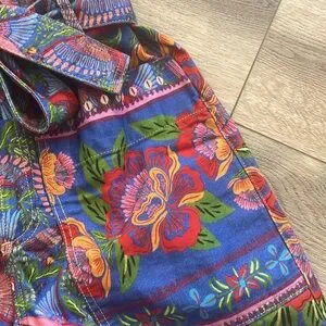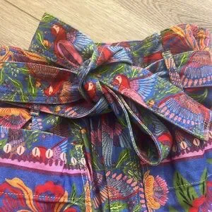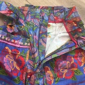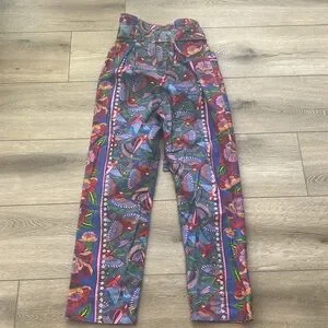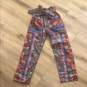 These hundred percent cotton pants are so adorable. They have a very soft feel to them super vibrant removable belt high waisted I bought for a trip but never ended up wearing and haven’t worn since somebody should really snag these up!