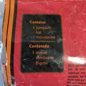 Includes jumpsuit costume with Velcro closure, red hat with M logo, and stick on mustache.
