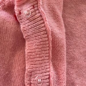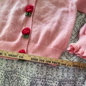 This Over Keshas cute Barbiecore pink cardigan has crocheted red strawberry "buttons", a Peter Pan collar with ruffles, generous long sleeve with ruffle cuffs and pleats at the shoulder. The actual buttons are clear plastic. It has an all-over fuzzy textured appearance. Sz L/XL. No stains or odors.