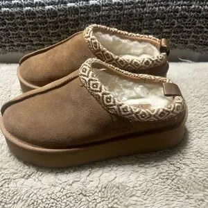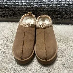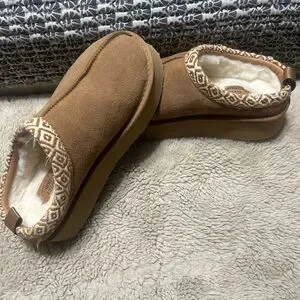 Step into comfort with these warm tan slippers featuring a stylish patterned trim. Perfect for cozy days at home.