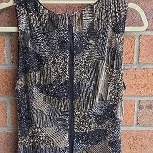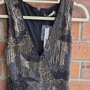 Alice & Olivia dress with black, silver, gold beading. Deep v-neck (9"). Great party dress. Fabric has some stretch, back slit, fully lined with back zipper closure. Excellent condition. New with tags and extra beads. Retail $698