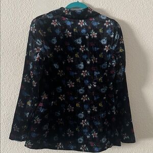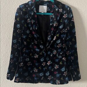 Chic velvet blazer with vibrant floral design. Features a sleek black base. Perfect for stylish layering. Size 4. In great condition