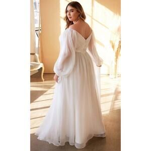 The Cinderella Divine white off shoulder ethereal wedding gown in size 22 is a stunning ball gown made of chiffon material with a plunging neckline and long sleeves, offering a princess-like look. The dress has a zipper back closure and a full-length silhouette, making it a perfect choice for brides looking for a romantic and elegant wedding gown. Its off-white color adds a touch of sophistication, making it a standout choice for those wanting to feel like a fairy tale princess on their special day.