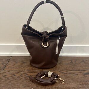 Not yet available online, this stunning bucket bag and its gleaming gold hardware bring a contemporary appeal that takes you from desk to dinner with ease. This timeless piece, available in a rich chocolate brown hue, also features a refined twist knot closure and an interior pocket for added convenience. To top it off, there is an additional shoulder strap so that the bag can also be worn as a crossbody bag. Absolutely GORGEOUS!