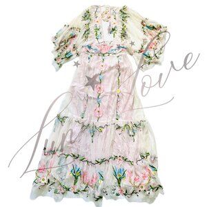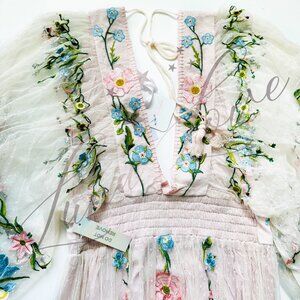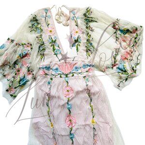 NWT! Fillyboo Angel Maxi Dress In Filigree Nouveau Lavender. Featuring floral hand embroidery and ruffle detailing, kimono "angel" sleeves & our deep V-neck styling. Perfectly fitted with elastic shirred panels at the waist.