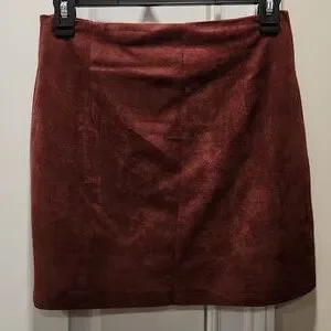 Elegant burgundy mini skirt with sleek gold zippers. Perfect for a trendy outfit.