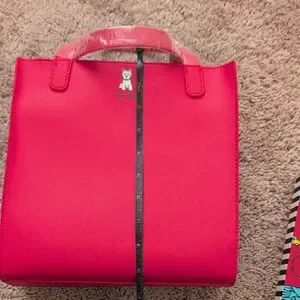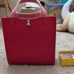 Charming red dog carrier tote and wallet set, perfect for pet lovers on the go. Features a playful dog design.