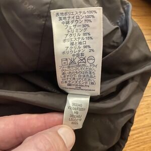 Materials (per tag): Shell 100% Polyester; Lining 100% Nylon; Insulation 70% Down / 30% Feathers; Trim 85% Acrylic/15% Polyester; Collar & Cuff 98% Acrylic/2% Spandex