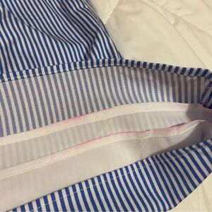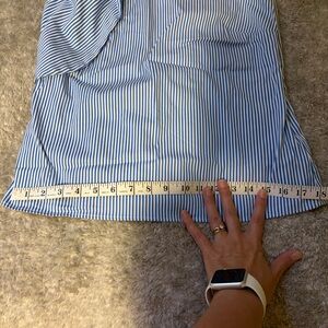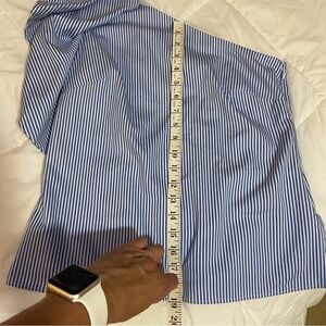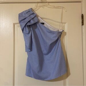Size 6 One Shoulder Blue and White Stripe Banana Republic Ruffle Shoulder Top in Preowned Condition- there is some discoloration on the lining, see pic