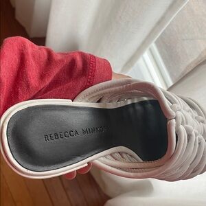 White strappy block heel mule sandals from Rebecca Minkoff.