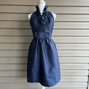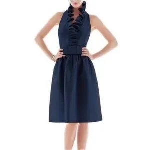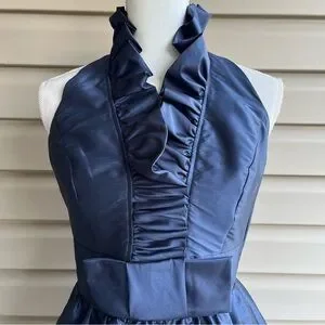 This is a gorgeous halter neck party dress from Alfred Sung, ladies size 4. The taffeta-like fabric, 100% polyester, is in Midnight blue. Features a fitted bodice, V-neckline with ruffle detail that extends around the back of the neck where there is a large snap and slide bar closure, stays in the bodice, bow detail at the waistline, hidden in-seam pockets(!), and zipper closure in the back. A stunning dress for your special occasion!