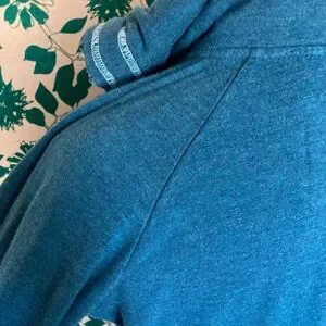 Stylish blue hoodie with pink graphic design. Features a full zip and drawstring hood. Comfortable, soft and made from organic materials.