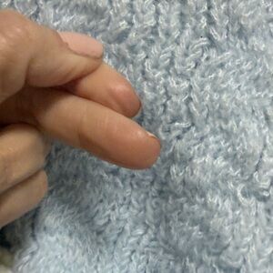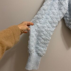 Chic light blue sweater with charming cream floral buttons. Perfect for a cozy, stylish look.