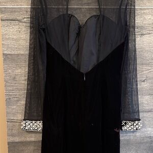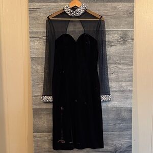 Sherri Hill Velvet Sweatheart Neckline Mesh, Crystal & Pearl detail Midi Dress