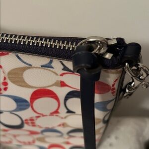 Chic Coach crossbody with a bold pattern. Features navy accents and a vibrant design. Ideal for everyday style.