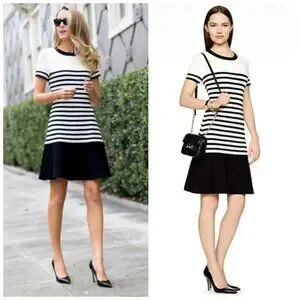 This Kate Spade drop waist scuba dress is the perfect mix of playful and polished. The black and ivory stripe pattern adds a timeless touch, while the fit-and-flare silhouette creates a flattering, feminine shape. Crafted from a structured scuba fabric, it holds its shape beautifully and is ideal for both work and weekend wear.