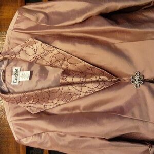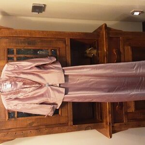 Tall 62 inches, 2 piece lustre dress with jacket. Features elegant lace trim and brooch and sequins detail. Ideal for formal events or mother of the bride.