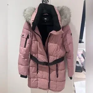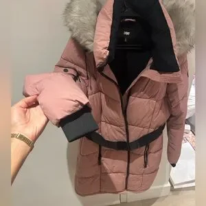 DKNY Pink Puffer Coat with black belt and removable Fur Hood